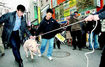 The police confiscate a pig from farmers in downtown Seoul on February 12. Farmers had brought the pig, along with six goats, into the street in a...