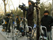 Press covering the six-party talks, which restarted on December 18, gather at the gate of the North Korean Embassy in Beijing on December 21 to...