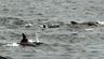 A dolphin (front, far left) that was released back into the wild in July was observed off the coast of Jeju Island interacting with other dolphins...
