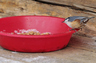A plump nuthatch bird eats from a dog’s bowl in Gangwon Province (by Kang Jae-hoon, staff photographer)