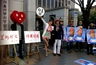 Performance artists gather outside Seoul Western District Court on Mar. 26 for the first hearing in the trial of political artist Lee Ha. On the...